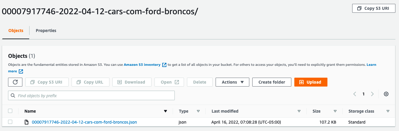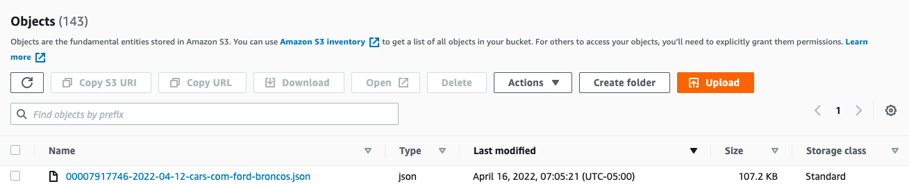 - Ensure you’re looking at one JSON file by moving the target JSON into a new S3 Bucket folder.