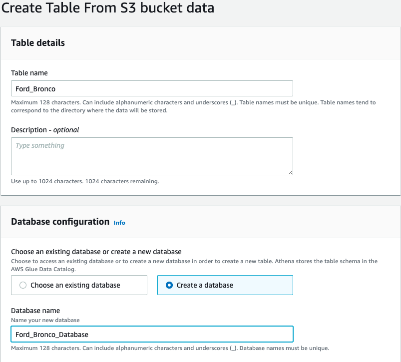 Unless you’re using a special Data Source setup, stick to using the default ‘AwsDataCatalog’. From the Tables and views tab, select Create and choose to create a table from S3 bucket data.
