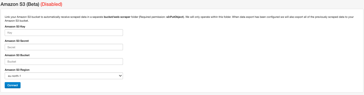 In the Amazon S3 tab, you’ll need to configure an S3 Sync by filling out your S3 key, secret, bucket, and region, then clicking connect:
