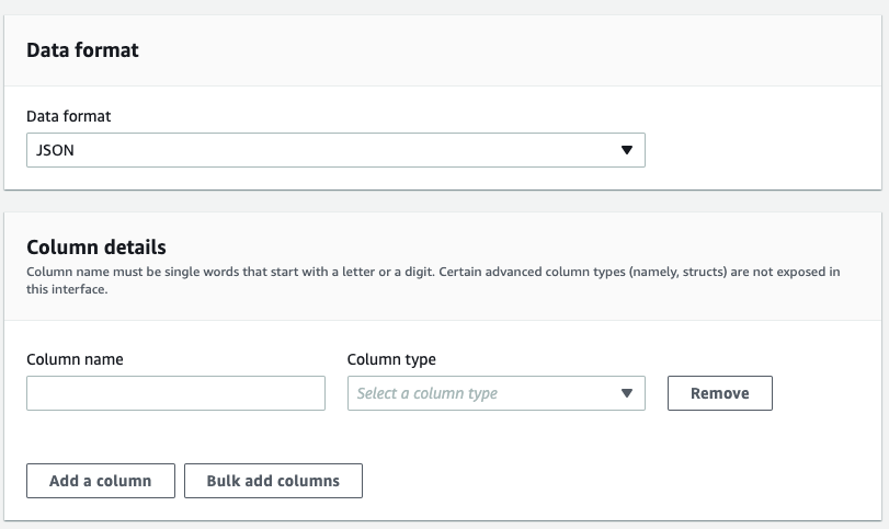 You’ll need to specify your input file in JSON format and define your columns. The easiest way to accomplish this is to Bulk add columns: