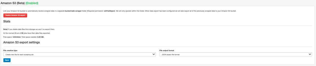 Once connected, the green (Enabled) text confirms the sync is active. Beyond basic sync statistics, it shows us that a new file will appear in S3 for each scraping job. At this point, ensure your ‘File output format’ is JSON.