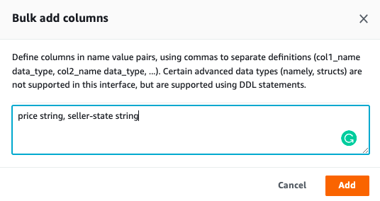 Within the bulk add prompt, you’ll have to specify your columns and data types. Keep in mind that all values in the JSON object are data type string from the scraper, and we’ll perform conversion later.